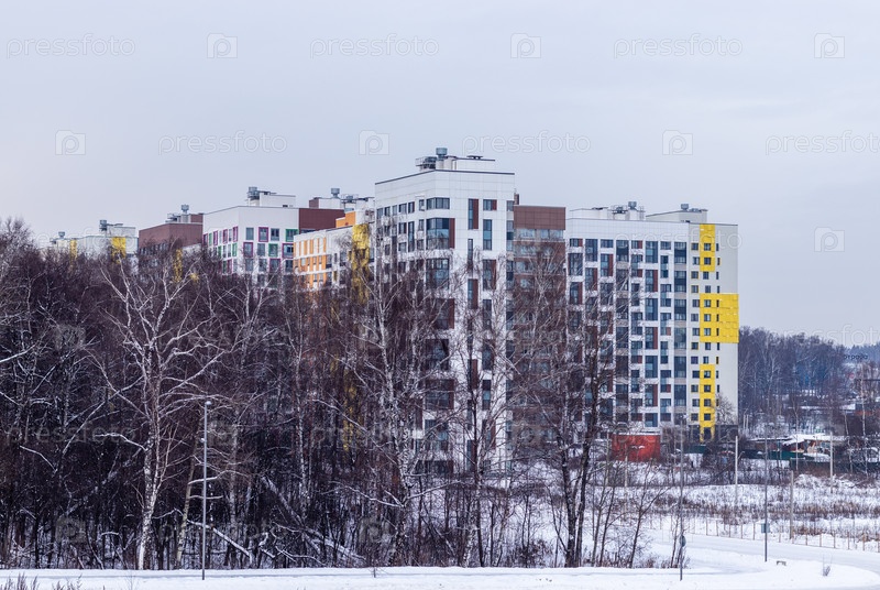 Современный многоквартирный дом с красочными фасадами на окраине города. Москва, Россия