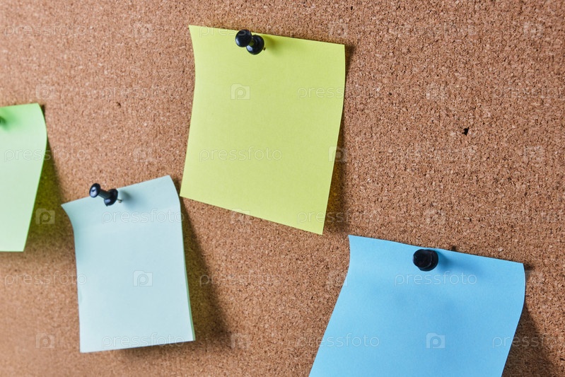 Несколько цветных листов для заметок, прикрепленных к пробковой доске, выборочный фокус, пространство для копирования