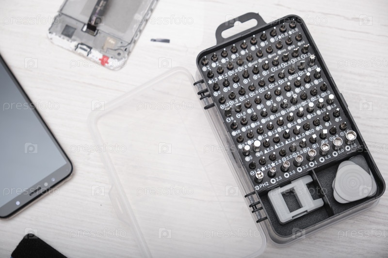 Крупный план набора отверток в черной коробке, перчаток, сломанного смартфона и набора инструментов для замены стекла телефона и планшета