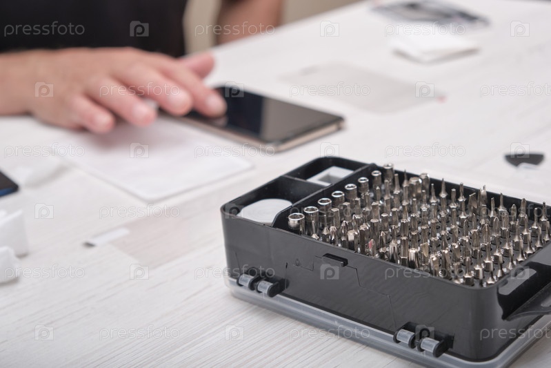 Набор отверток в черном ящике крупным планом, мужчина проверяет отремонтированный телефон, концепция ремонта смартфона