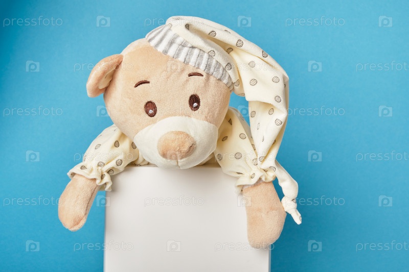 Плюшевый мишка с пустой запиской на синем фоне