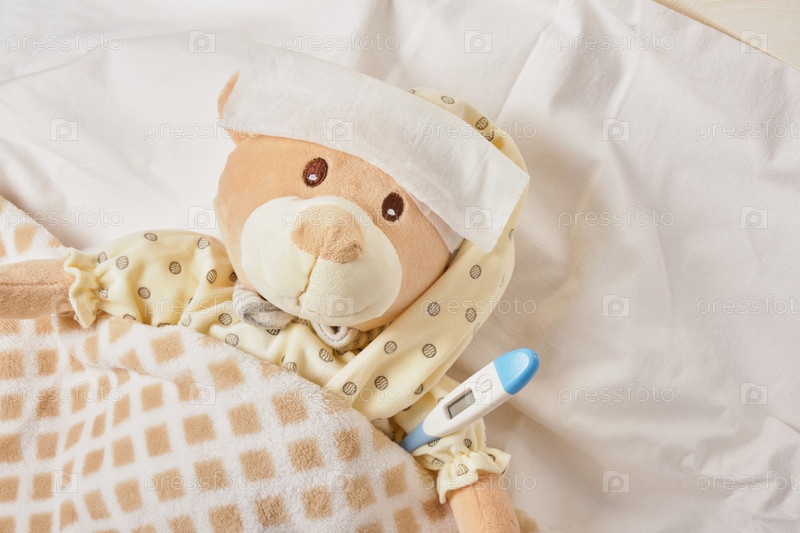 Плюшевый мишка лежит больным в постели с термометром