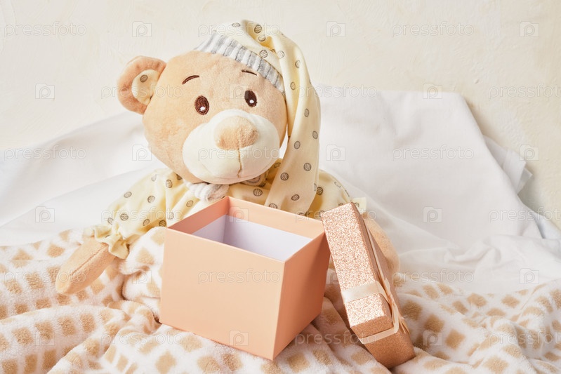 Дизайн рождественской открытки с плюшевым мишкой и подарочной коробкой