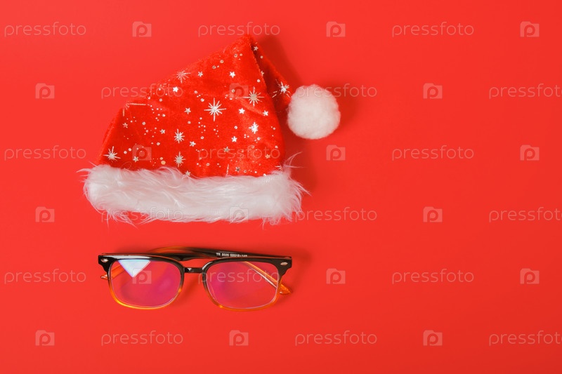 Очки для зрения и праздничная рождественская шапка санта на красном фоне
