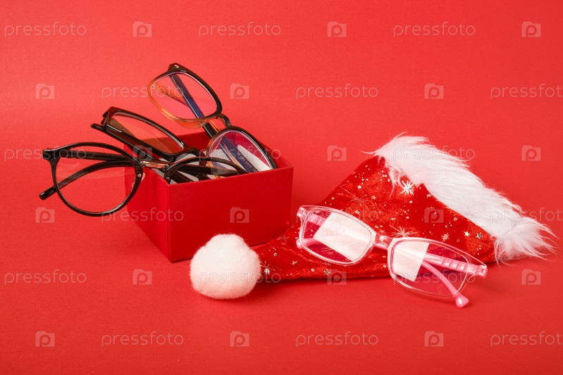 Красная подарочная коробка, различные очки для зрения и праздничная рождественская шапка санта-клауса на красном фоне