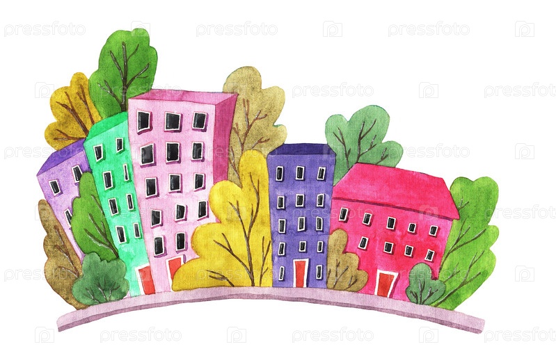 Разноцветные домики и деревья, акварель (3)