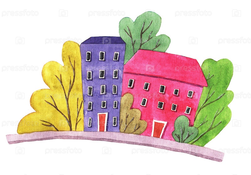 Красочные дома и деревья, акварель