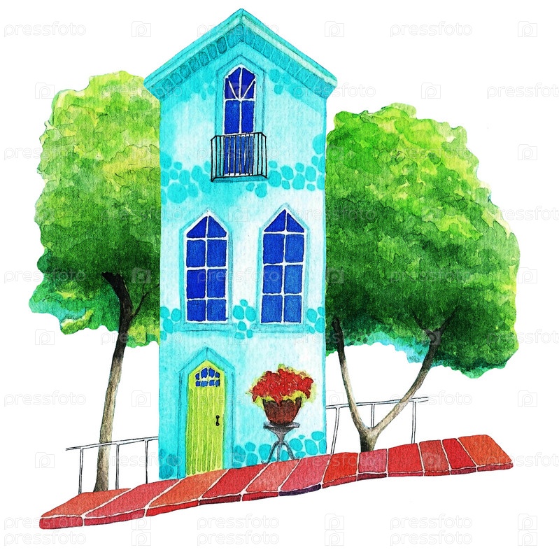 Синий дом и деревья, акварель