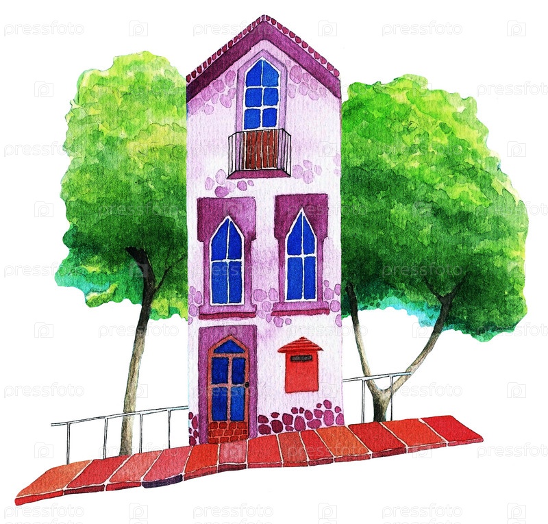 Сиреневый дом и деревья, акварель
