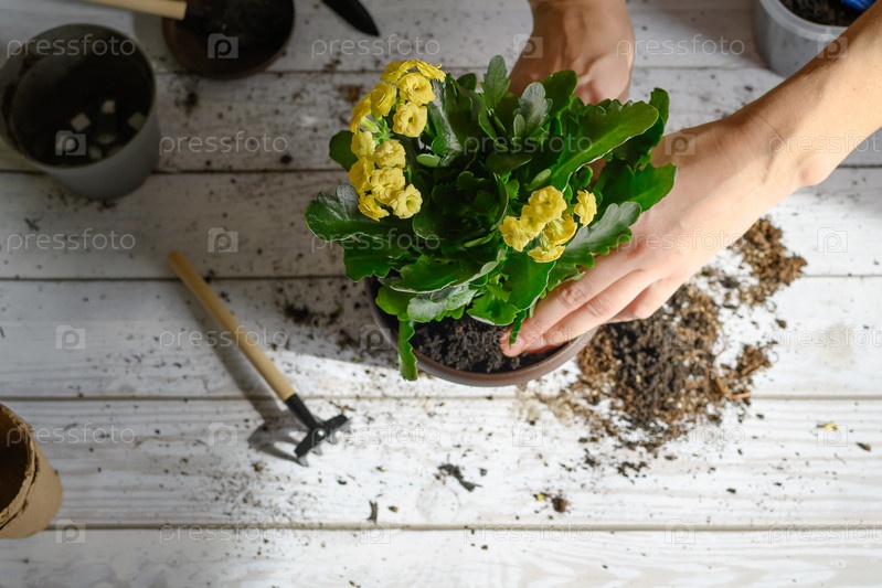 Женские руки пересаживают цветок тюльпана в другой горшок на столе. Домашнее садоводство