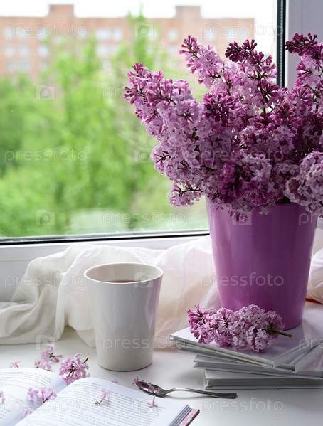 Открытка красивая. Кружка чая, старая книга и букет фиолетовой сирени. Красивый натюрморт. Весеннее время. Концепция доброго утра