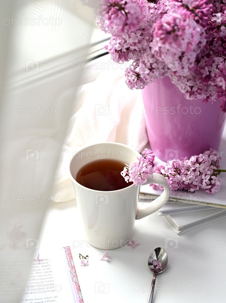 Открытка красивая. Кружка чая, старая книга и букет фиолетовой сирени. Красивый натюрморт. Весеннее время. Концепция доброго утра