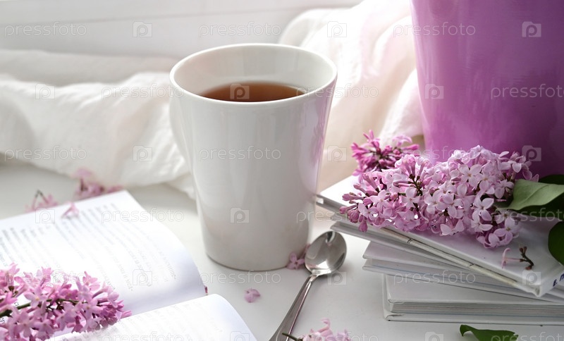 Открытка красивая. Кружка чая, старая книга и букет фиолетовой сирени. Красивый натюрморт. Весеннее время. Концепция доброго утра