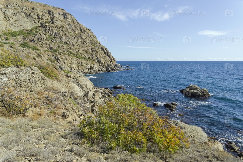 Берег Черного моря. Мыс Меганом, Крым, солнечный день в сентябре