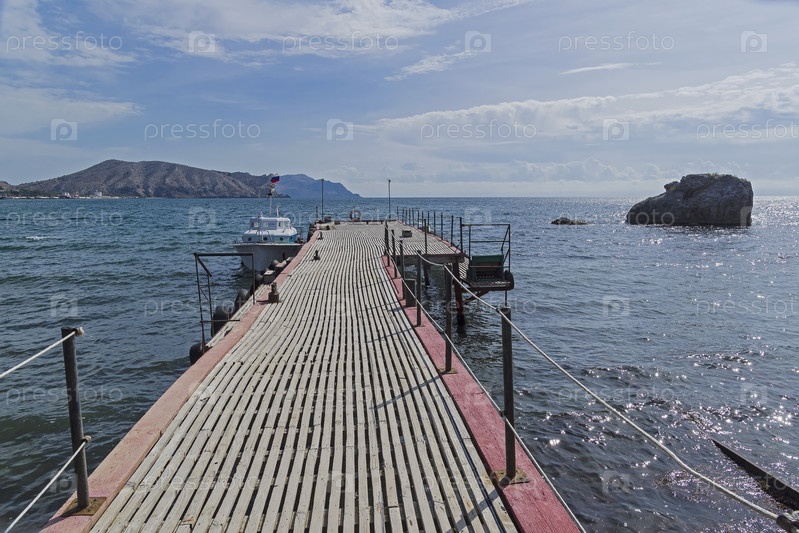 Небольшой катер пришвартован у причала. Бухта курортного города Судак, Крым. Солнечный день в сентябре