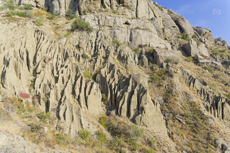 Причудливый рельеф, образовавшийся в результате эрозии почвы и выветривания на глиняном склоне у подножья мыса Меганом. Крым, солнечный день в сентябре