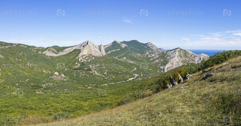 Вид на долину с вершины горного хребта. Токлукский хребет, Крым, солнечный день в сентябре