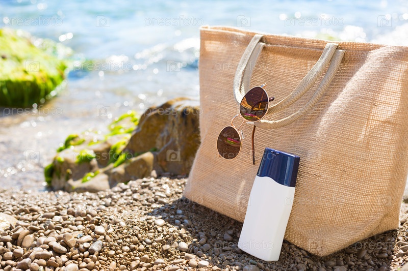 Пляжная сумка с белым экологичным тюбиком солнцезащитного крема на галечном побережье у моря. Путешествие, отдых на курорте, очки. Натуральная защита кожи от УФ-лучей, масло для загара. Скопируйте пространство, макет