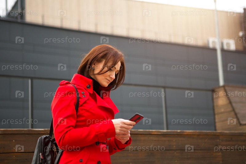 Женщина в красном плаще разговаривает по телефону возле бизнес-центра. Брюнетка со стрижкой боб осенью или весной ведет дела, общается удаленно