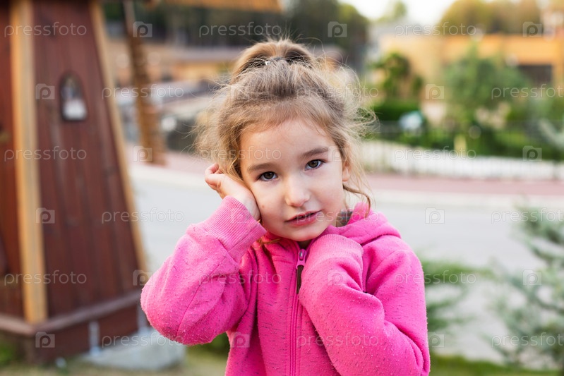 Маленькая девочка в розовой толстовке с грустным и заплаканным лицом держится за ухо. Ушная боль, отит, отек щеки, десен, зубная боль, детская хирургия, отоларингология. Детская медицина
