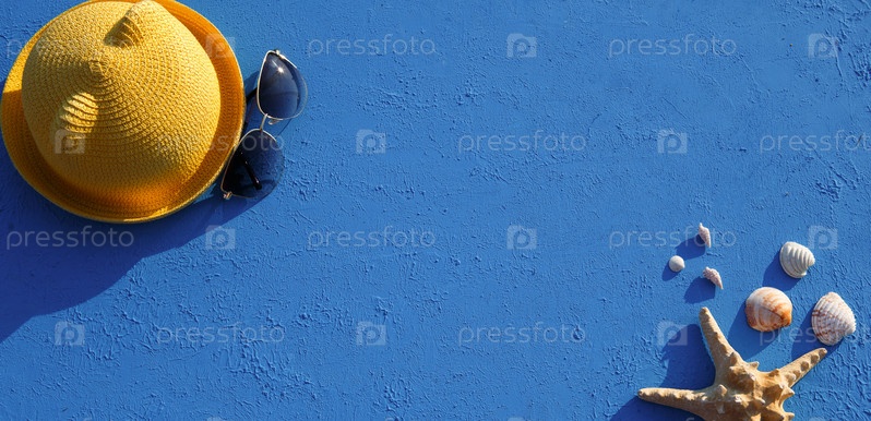 Рамка с пляжными аксессуарами на морскую тему: желтая соломенная шляпа, солнцезащитные очки, морские звезды и ракушки на синем фоне. Концепция отдыха, морская прогулка, защита от ультрафиолета, плавание. Скопируйте пространство. Флэтлей