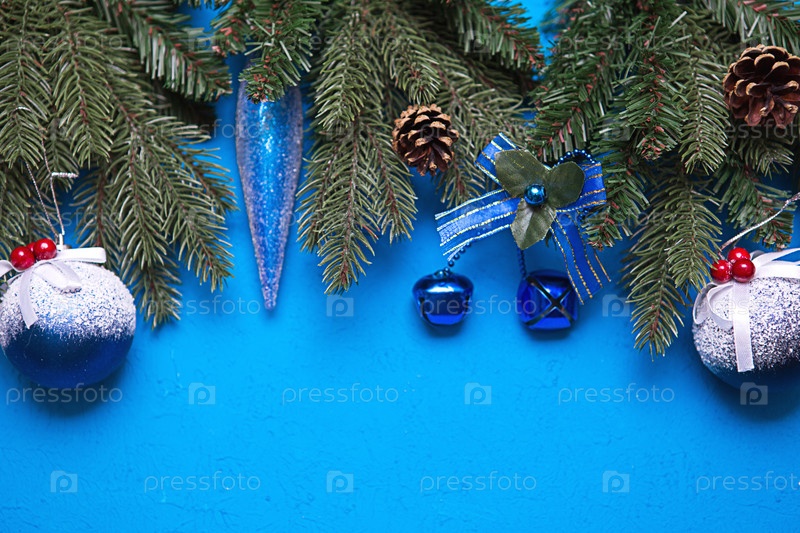 Новогодние украшения из искусственной ели, шары со снегом и ягодами, шишки, колокольчики, сосульки на голубом фоне. Новый год, холодная атмосфера, мороз и лед. Рамка, место для текста
