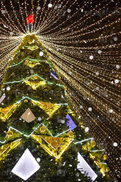 Высокая городская рождественская елка в парке с шапкой из светящихся гирлянд, светится ночью на улице. Рождество, новый год, украшение города. Калуга, Россия