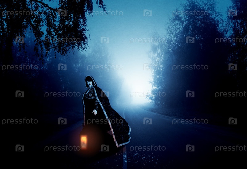 Женщина с фонарем на туманной дороге