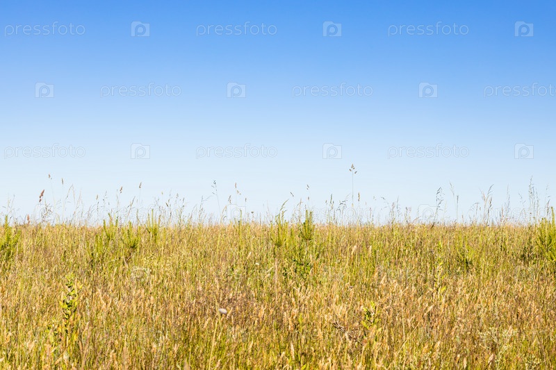 Голубое небо над желто-зеленым полем жарким летом
