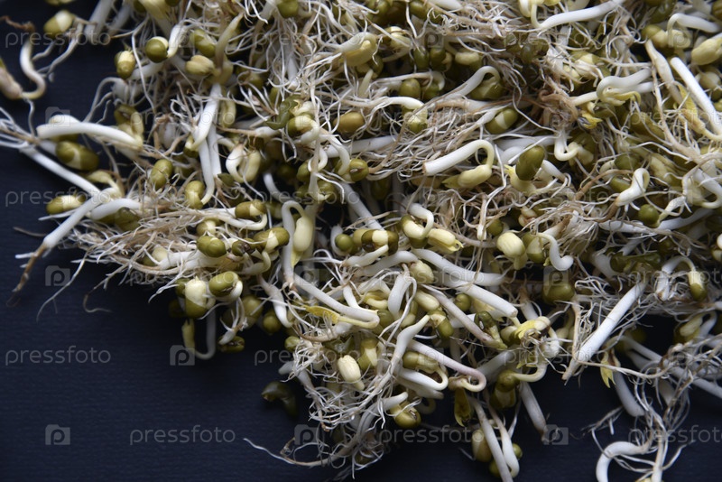 Проросшие бобы нута с листьями и корнями для салата. Проросший нут крупным планом в блюдце для салата