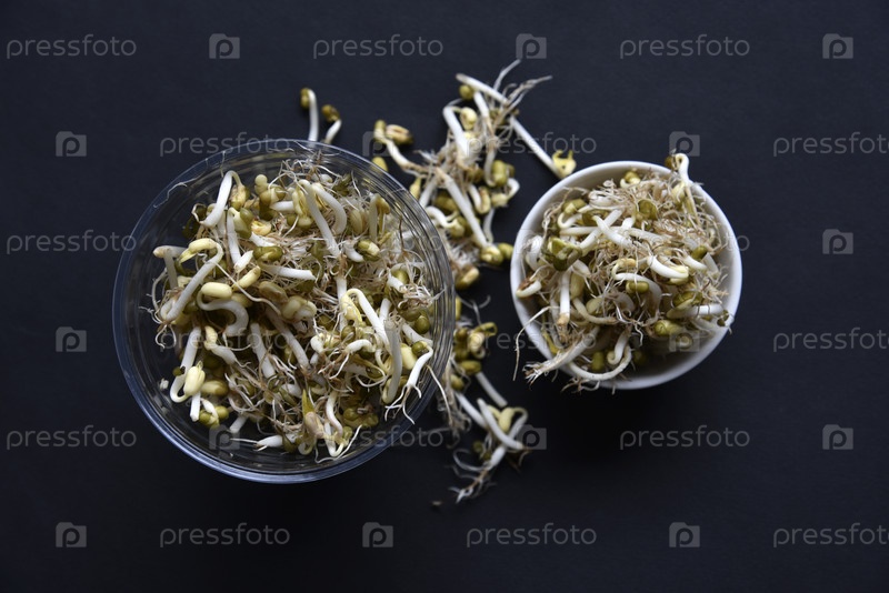 Проросшие бобы нута с листьями и корнями для салата. Проросший нут крупным планом в блюдце для салата