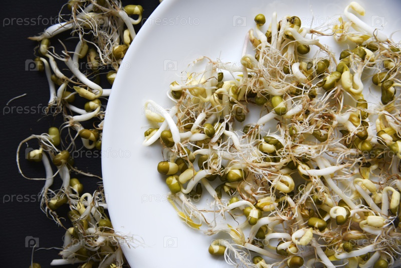 Проросшие бобы нута с листьями и корнями для салата. Проросший нут крупным планом в блюдце для салата