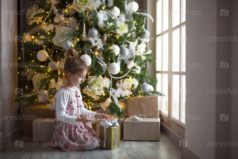 Маленькая девочка в красивом платье сидит под елкой с подарочной коробкой и бантом. Свет из большого окна, темная комната, домашний уют, Рождество, волшебство и радость. Новый год, белый декор