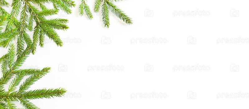 Естественная рамка из свежих зеленых еловых ветвей на белом фоне. Рождество, новый год, елка. Копировать пространство