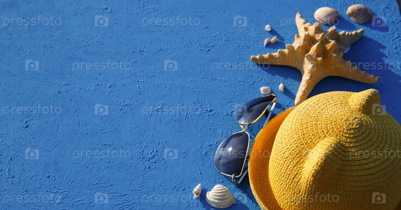 Рамка с пляжными аксессуарами на морскую тему: желтая соломенная шляпа, солнцезащитные очки, морские звезды и ракушки на синем фоне. Концепция отдыха, морская прогулка, защита от ультрафиолета, плавание. Скопируйте пространство. Флэтлей
