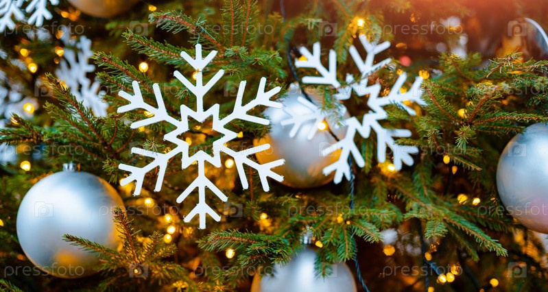 Новый год. Снежинка, фон, огни, свободное пространство Размытие, мягкий фокус, украшенная елка