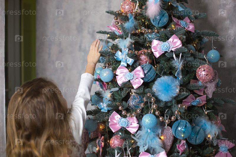Маленькая девочка тянется рукой к елочной игрушке. Рождественский декор, ожидание праздника и чуда. Новый год. Белый, розовый и голубой декор, гирлянды из золотых огней