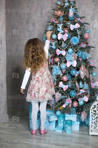 Маленькая девочка тянется рукой к елочной игрушке. Рождественский декор, ожидание праздника и чуда. Новый год. Белый, розовый и голубой декор, гирлянды из золотых огней