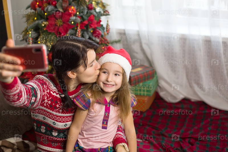 Мама и дочка сидят возле елки, обнимаются, фотографируются и делают селфи на телефон, общаются по видеосвязи, веселятся. Рождество, Новый год дома. Копировать пространство