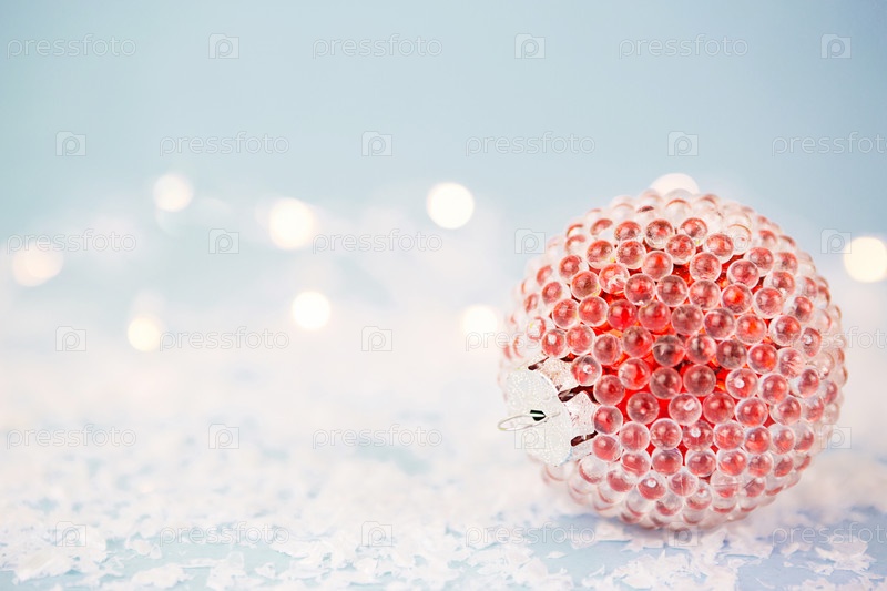 Красный елочный шар на синем фоне с искусственным снегом и огнями гирлянд в боке. Праздничный фон, новый год. Копировать пространство