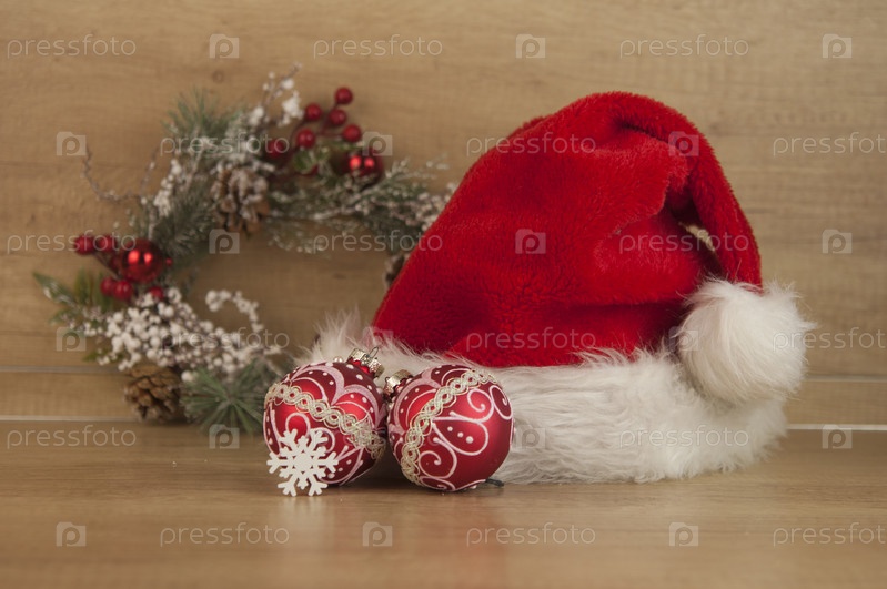 Новогодний фон с елочным шаром на деревянном фоне. Рождественский фон