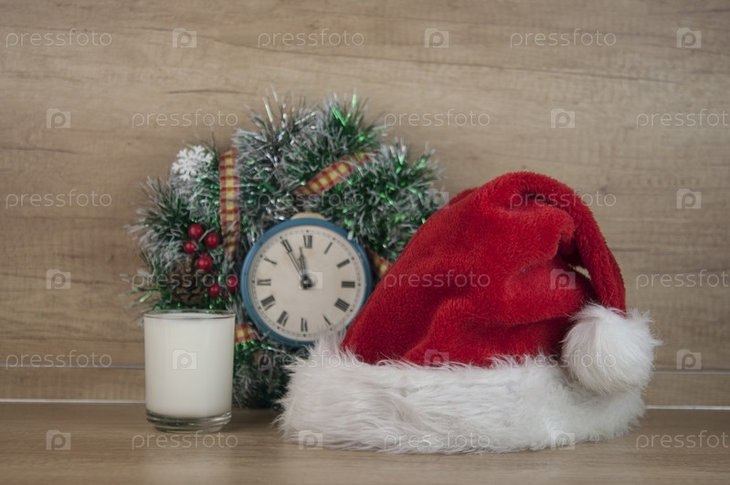 Стакан молока с красной шляпой Санты на деревянном фоне