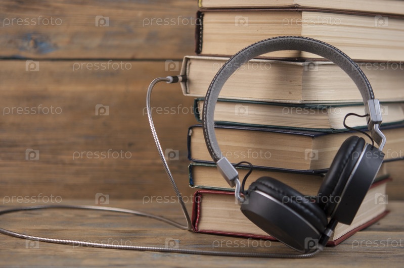 Концепция аудиокниги. Наушники и книга над деревянным столом с местом для текста