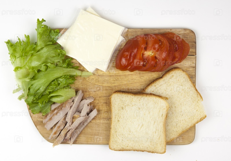 Бутерброд с ветчиной, сыром, помидорами, листьями салата и поджаренным хлебом. Вид сверху на белом фоне