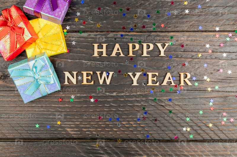 Креативная праздничная открытка с деревянным текстом с новым годом и кучей сверкающих подарочных коробок с подарками. Скопируйте место для текста