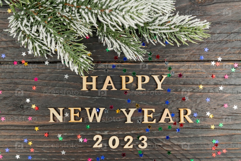 С Новым 2023 годом. Деревянный текст и цифры 2023 на деревянном фоне с разбросанными золотыми конфетти и еловой веткой