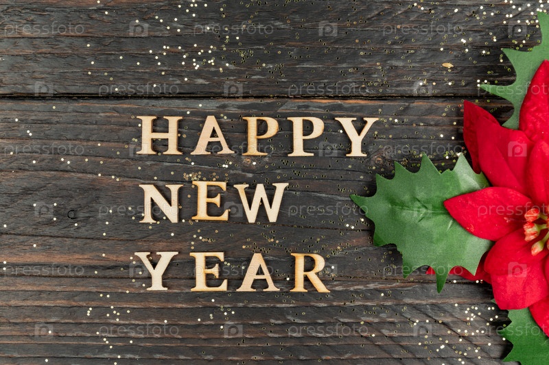 С Новым 2023 годом. Деревянный текст и пуансеттия на деревянном фоне. Плоская укладка