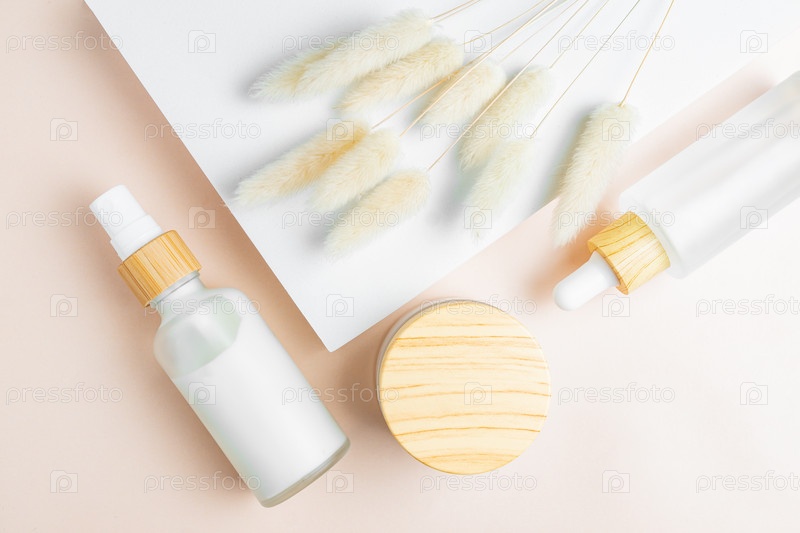Упаковка косметики. Набор различных косметических флаконов крема или сыворотки на белом подиуме с цветами лагуруса. Пустая упаковка. Концепция продукта спа-салона природной красоты. Красота. Макет