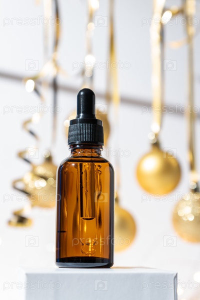 Рождественская косметика. Бутылка-капельница из темного стекла с косметическим маслом для лица на фоне сверкающих золотых безделушек на белом подиуме. Концепция подарка по уходу за лицом и телом