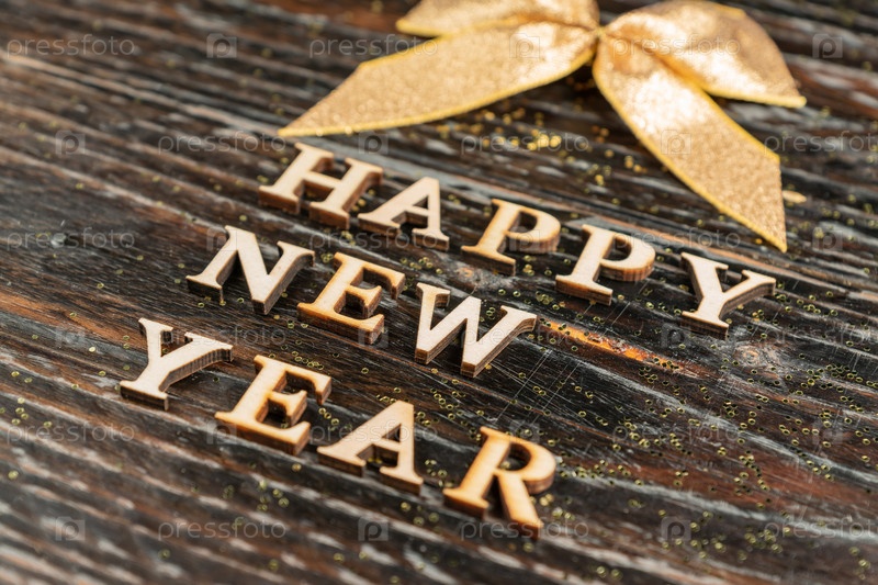 Поздравительная новогодняя надпись из деревянных букв с золотым бантом. Концепция праздника. Праздничный фон